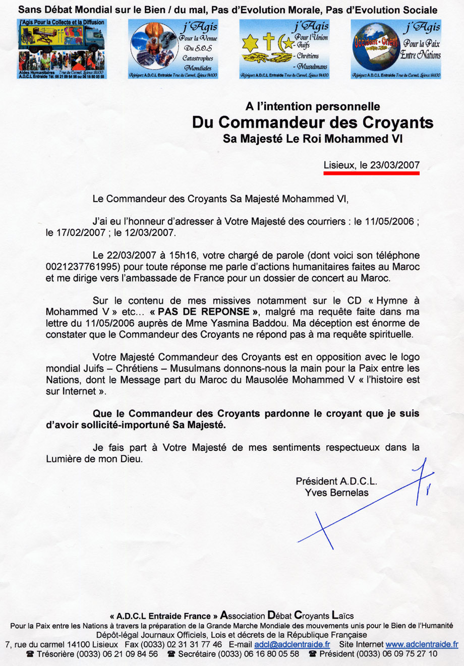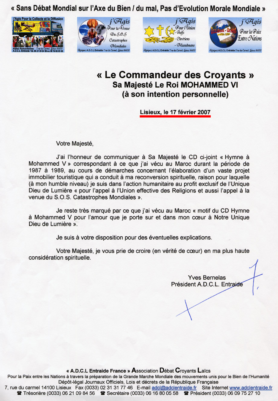 Rabat, le 23/01/1989, Yves Bernelas se rend au Mausolée MOHAMMED V, il vient supplier l'Âme de MOHAMMED V de l'aider. Subitement, un souffle (comme une sorte de vent tourbillonnant) l'envahit d'un bien-être, tout à coup il entend une voix lui dire "Différentes familles prient le même Dieu de la Création que toi". Il est stupéfait, regarde autour de lui, ne comprend pas d'où vient la voix ? Les jours et les mois suivants, le message revient constamment à son Esprit, progressivement s'instaure une prise de conscience sur l'Union Juifs - Chrétiens - Musulmans. Il se pose la question : pourquoi lui, en rapport de la multitude des êtres religieux ou spirituels dans le monde ? De plus, SM Le Roi HASSAN II, Réunificateur, Sauveur, Rassembleur, Commandeur des Croyants, l'impressionne tellement qu'il s'efforce de renoncer à la possibilité de transmettre le Message au Roi, ne se sentant pas à la hauteur. Alors qu'il est en France une impulsion pousse Yves Bernelas a adresser le 01/04/1989 une lettre écrite à SM Le Roi HASSAN II, le contenu est développé verbalement le 23/06/1989 au Palais Royal auprès du Conseiller Ahmed Réda GUEDIRA.
